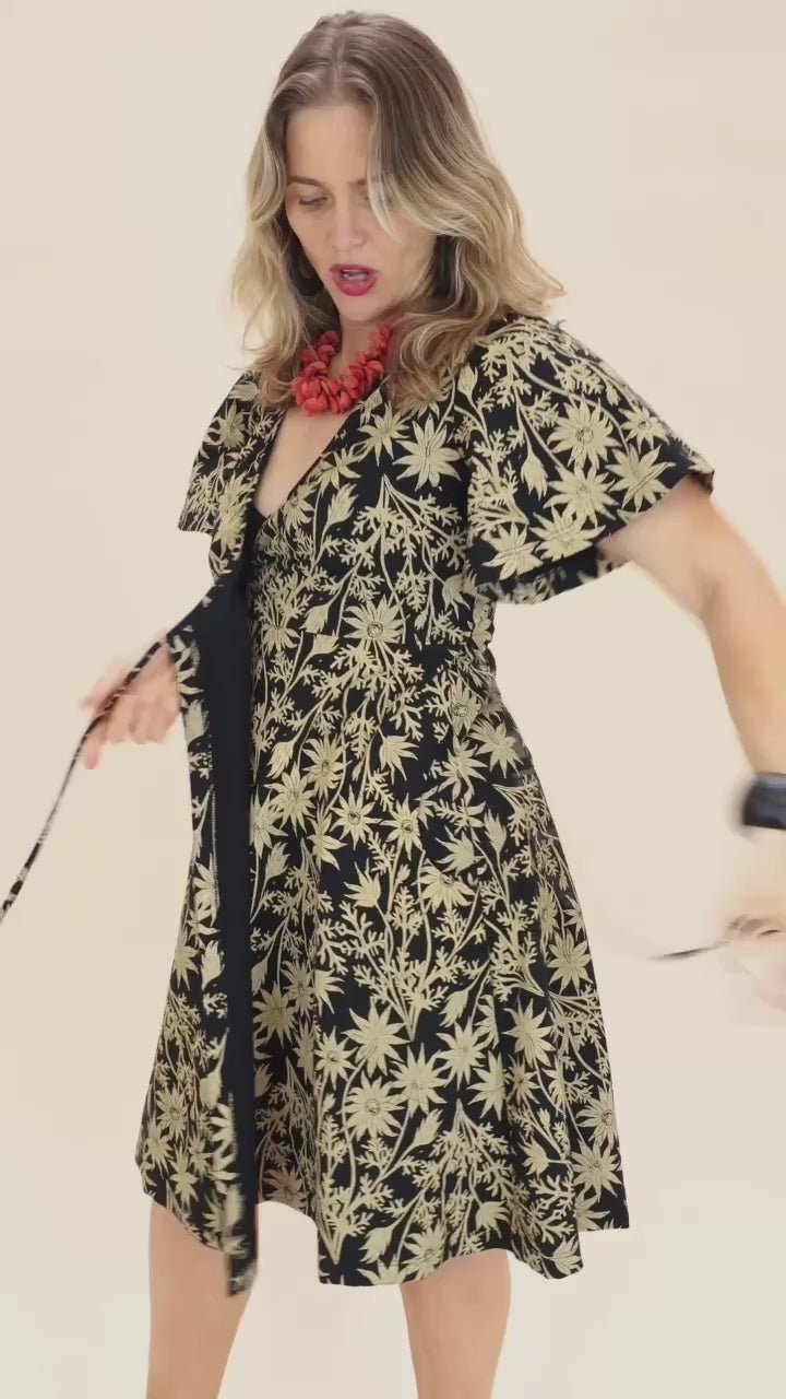 Summer-ready wrap dress with flutter sleeves and a comfy, flexible fit