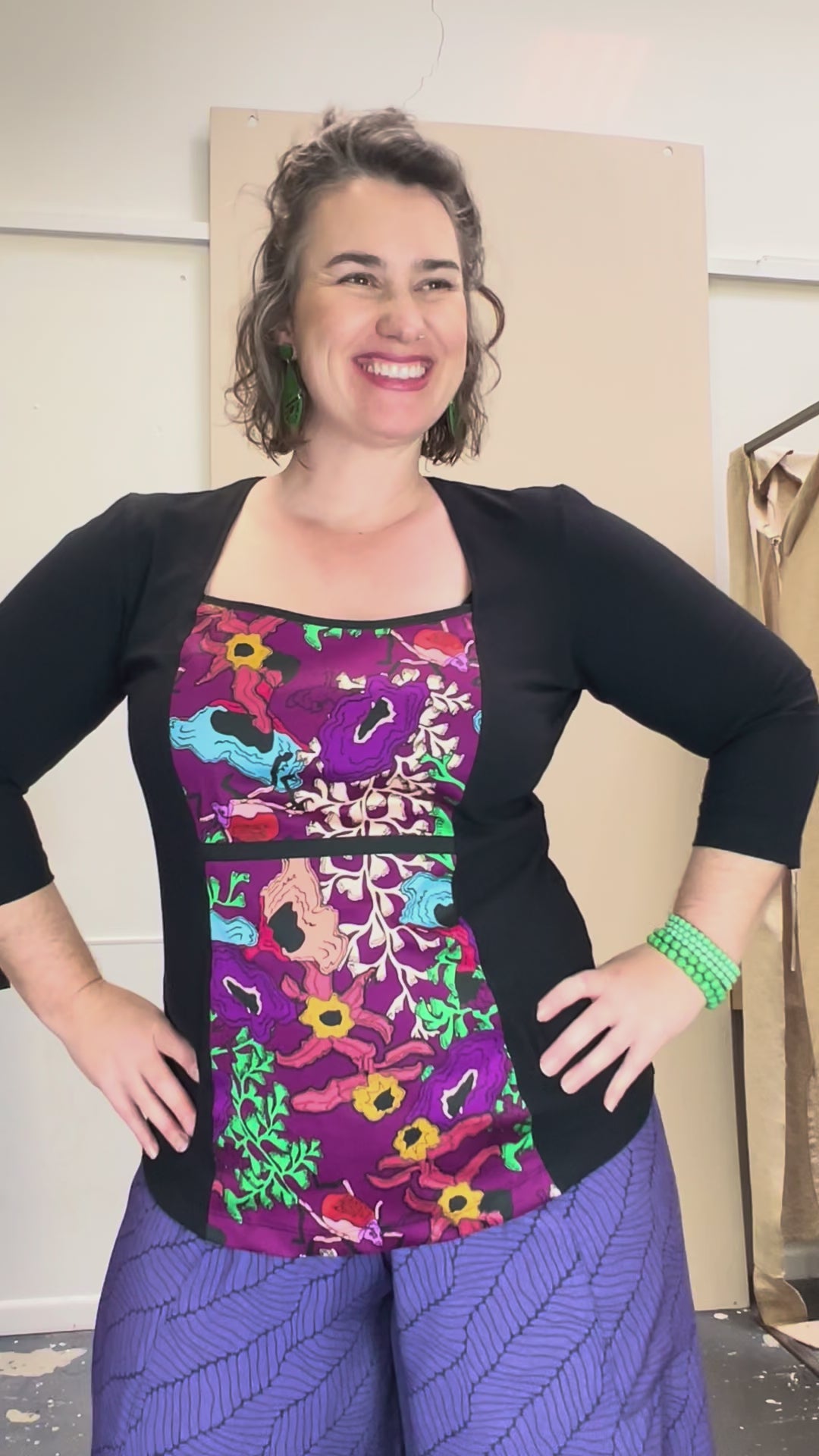 Clare wears size 14, 3/4 length sleeve in photo.